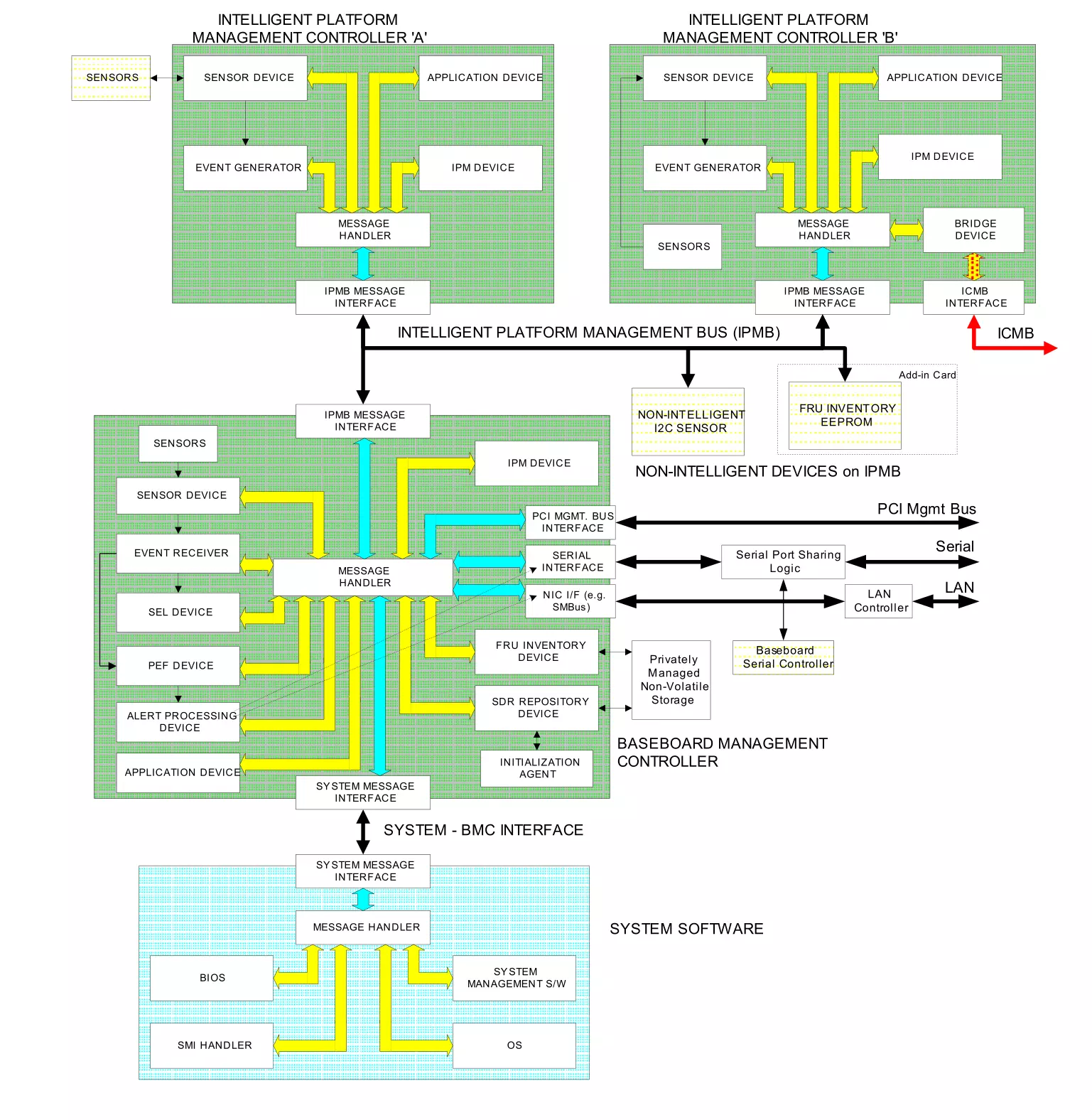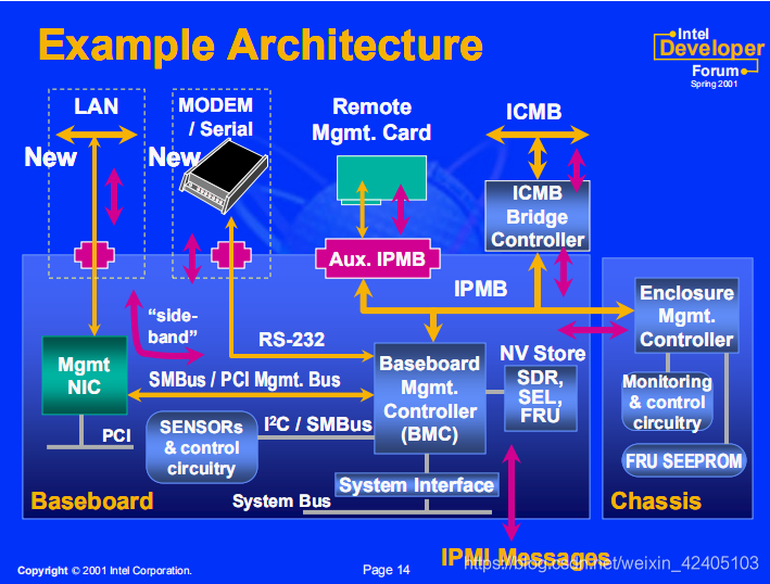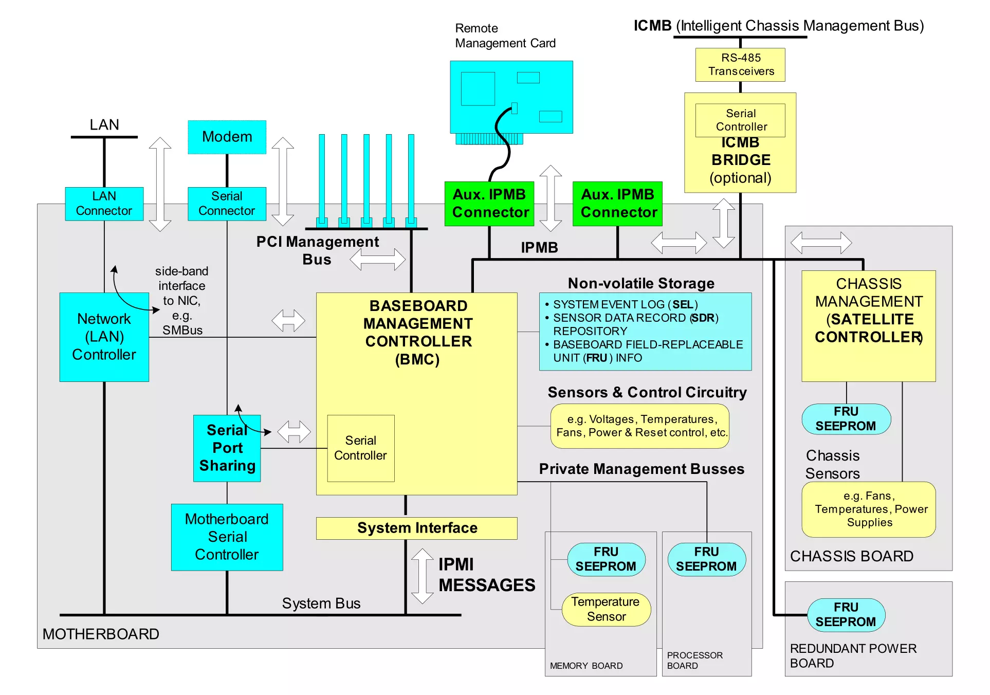 Sensors & Control Circuitry,这一部分虽然图中只占很小的一部分,但却是BMC最基本的功能:获取信息和控制环境。