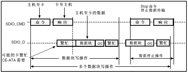数据在 SDIO 控制器与 SD 卡之间的传输。对于 SDI/SDIO 存储器,数据是以数据块的形式传输的,而对于 MMC 卡,数据是以数据块或者数据流的形式传输。本节我们