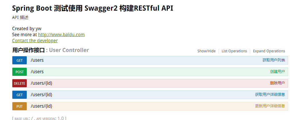 import java.util.*; import com.example.domain.User; import io.swagger.annotations.*; import org.springframework.web.bind.annotation.*; /*** * @ClassName: UserController * @Description: 程序入口类 * @Auther: ywang * @Date: 14:04 2019/3/25 * @version : V1.0 */ @Api(value="用户controller",tags={"用户操作接口"}) @RestController @RequestMapping(value="/users") // 通过这里配置使下面的映射都在/users下,可去除 public class UserController { static Map<Long, User> users = Collections.synchronizedMap(new HashMap<Long, User>()); /** * @Param [] * @Description: TODO * @auther: ywang * @date: 14:07 2019/3/25 * @return: java.util.List<com.example.domain.User> */ @ApiOperation(value="获取用户列表", notes="获取所有的用户列表") @RequestMapping(value={""}, method=RequestMethod.GET) public List<User> getUserList() { List<User> r = new ArrayList<User>(users.values()); return r; } @ApiOperation(value="创建用户", notes="根据User对象创建用户") @ApiImplicitParam(name = "user", value = "用户详细实体user", required = true, dataType = "User") @RequestMapping(value="", method=RequestMethod.POST) public String postUser(@RequestBody User user) { users.put(user.getId(), user); return "success"; } @ApiOperation(value="获取用户详细信息", notes="根据url的id来获取用户详细信息") @ApiImplicitParam(name = "id", value = "用户ID", required = true, dataType = "Long", paramType = "path") @RequestMapping(value="/{id}", method=RequestMethod.GET) public User getUser(@PathVariable Long id) { return users.get(id); } @ApiOperation(value="更新用户详细信息", notes="根据url的id来指定更新对象,并根据传过来的user信息来更新用户详细信息") @ApiImplicitParams({ @ApiImplicitParam(name = "id", value = "用户ID", required = true, dataType = "Long", paramType = "path"), @ApiImplicitParam(name = "user", value = "用户详细实体user", required = true, dataType = "User") }) @RequestMapping(value="/{id}", method=RequestMethod.PUT) public String putUser(@PathVariable Long id, @RequestBody User user) { User u = users.get(id); u.setName(user.getName()); u.setAge(user.getAge()); users.put(id, u); return "success"; } @ApiOperation(value="删除用户", notes="根据url的id来指定删除对象") @ApiImplicitParam(name = "id", value = "用户ID", required = true, dataType = "Long", paramType = "path") @RequestMapping(value="/{id}", method=RequestMethod.DELETE) public String deleteUser(@PathVariable Long id) { users.remove(id); return "success"; } }