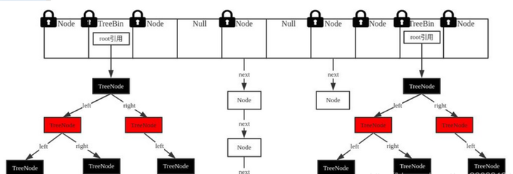 在 JDK1.8 中采用Node + CAS + Synchronized来保证并发安全进行实现,synchronized只锁定当前链表或红黑二叉树的首节点。如果相应位置的Node还没有初始化,则调用CAS插入相应的数据;如果相应位置的Node不为空,如果该节点的first.hash!=-1,则对该节点加synchronized锁,更新节点或插入新节点; 如果该节点的first.hash=-1,则扩容。读操作无锁,Node节点的val和next使用volatile修饰,数组也用volatile修饰。