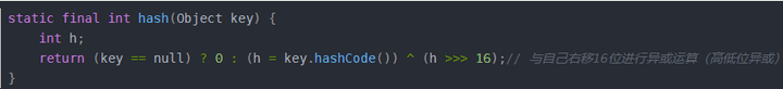 如果只使用hashCode取余,那么相当于参与运算的只有hashCode的低位,高位是没有起到任何作用的,所以我们的思路就是让hashCode的高位(与自己右移16位进行异或)也参与运算,来获取hash值,进一步降低hash碰撞的概率,使得数据分布更平均,我们把这样的操作称为扰动。