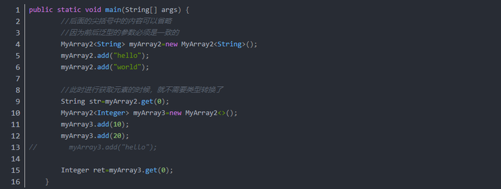 MyArray2<> myArray3=new MyArray2<String>();//省略之后,编译失败
