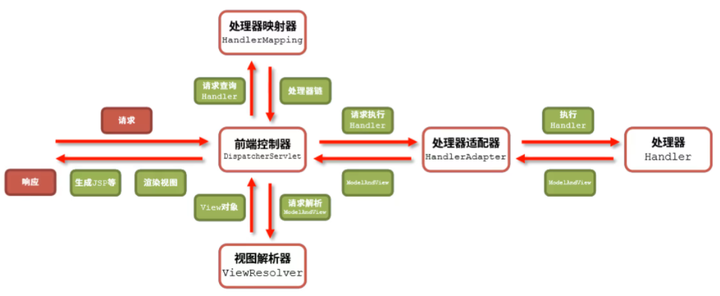 DispatcherServlet:前端控制器,是整体流程控制中心,由其调用其他组件处理用户的请求,有效的降低了组件间的耦合性