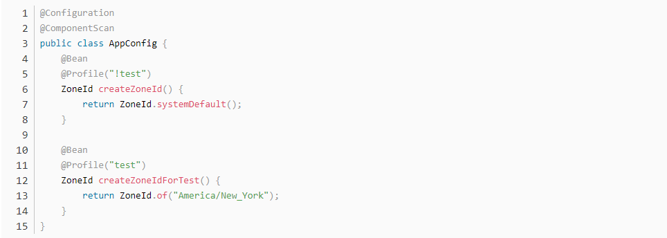 如果当前的Profile设置为test,则Spring容器会调用createZoneIdForTest()创建ZoneId,否则,调用createZoneId()创建ZoneId。注意到@Profile("!test")表示非test环境。