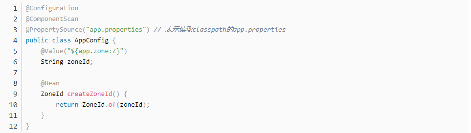 Spring容器看到@PropertySource("app.properties")注解后,自动读取这个配置文件,然后,我们使用@Value正常注入: