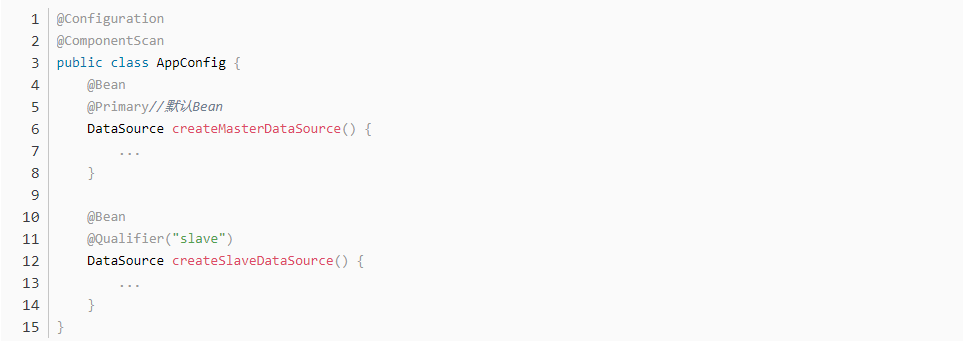 或者指定默认Bean,当注入时没有指定Bean的名字,则默认注入标记有@Primary的Bean:
