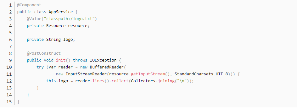 上图是工程的结构,我们需要读取logo.txt文件,通常情况下,我们需要写很多繁琐的代码,主要是为了定位文件,打开InputStream。Spring则提供了一个org.springframework.core.io.Resource,可以直接注入: