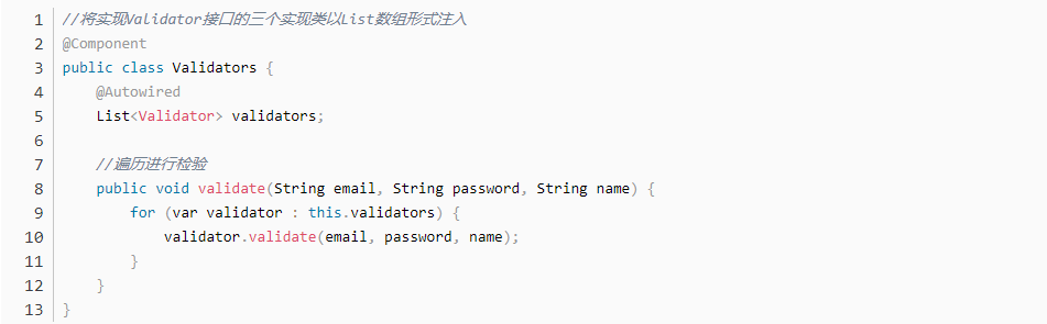 注意到Validators被注入了一个List<Validator>,Spring会自动把所有类型为Validator的Bean装配为一个List注入进来,这样一来,我们每新增一个Validator类型,就自动被Spring装配到Validators中了,非常方便。
