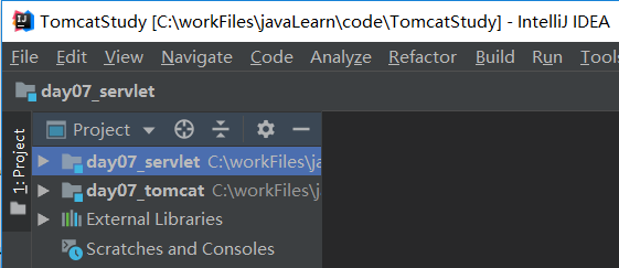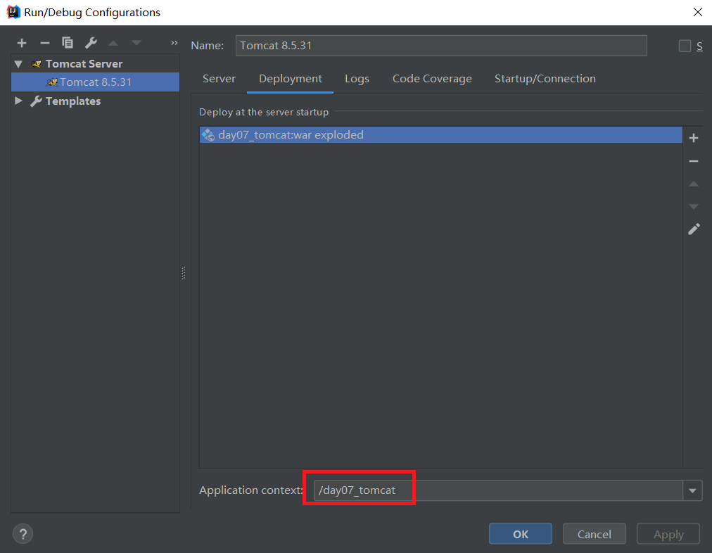 6. 多个项目修改项目访问路径,Run->Edit Configurations->Deployment,修改后项目的访问根路径就变成了http://localhost:8080/day07_tomcat,步骤5中的访问路径自然就变成了:http://localhost:8080/day07_tomcat/demo1