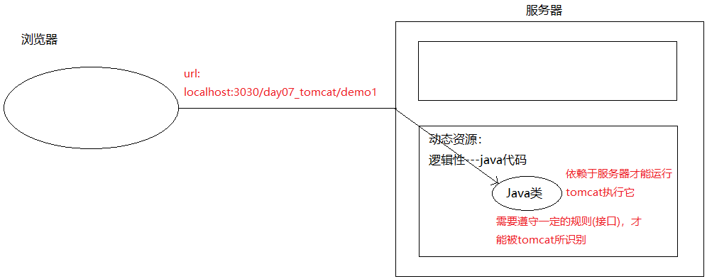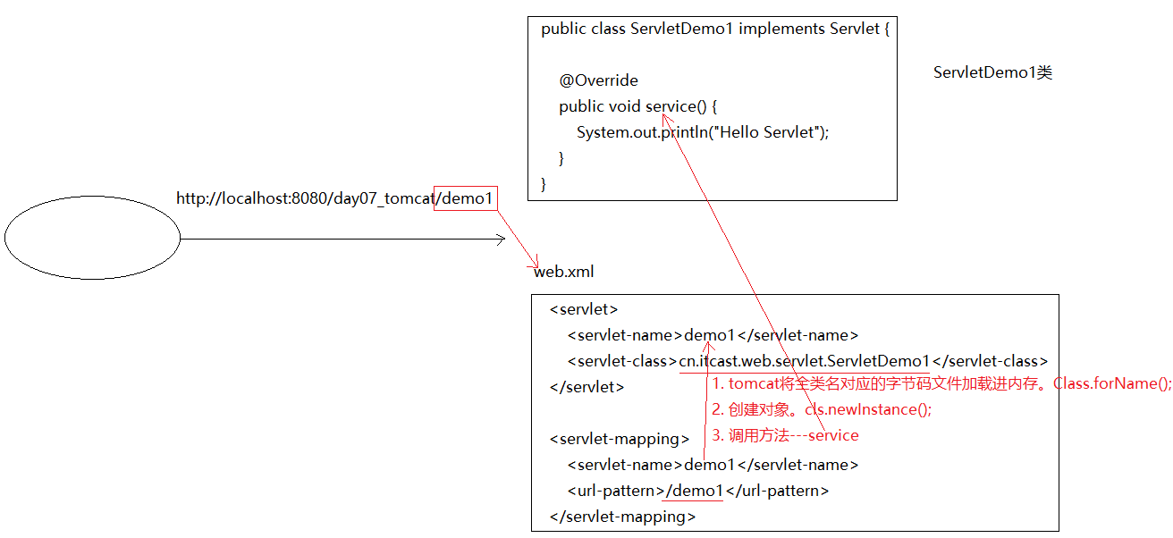 1. 当服务器接受到客户端浏览器的请求后,会解析请求URL路径,获取访问的Servlet的资源路径(demo1)