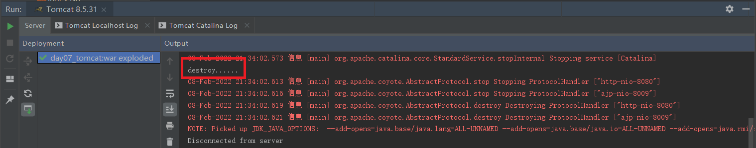 停止服务器后,则输出destroy...
