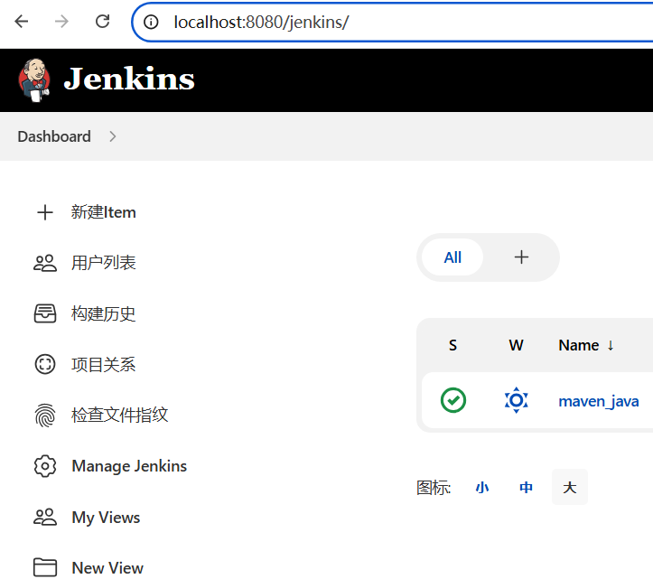 点击/jenkins,跳转到http://localhost:8080/jenkins/,可以访问到说明环境OK。8080是tomcat的端口号