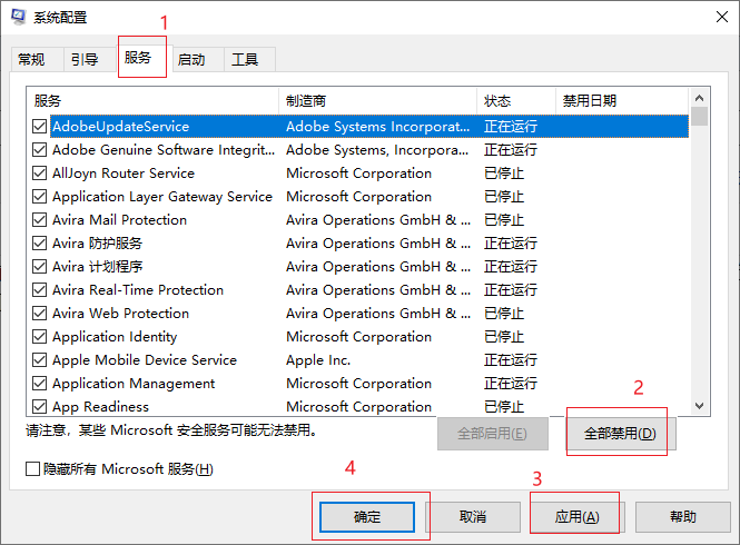 - 第二步:1,点击服务 ---> 2,再点击全部禁用 ---> 3,点击应用 ---> 4,确认 ---> 5,就会弹出一个小对话框,