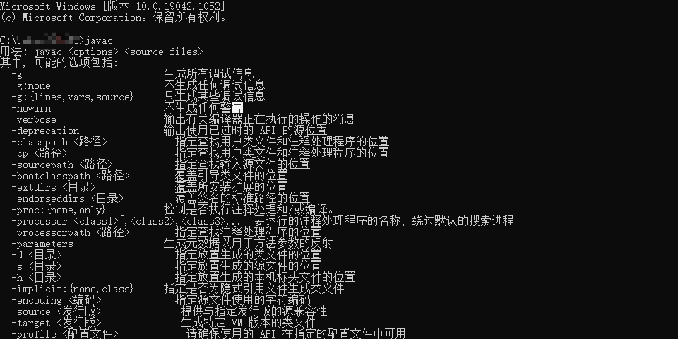 3, 测试是否安装成功,就按住 windows 图标 + r,输入cmd进入dos界面。再输入javac出现了如下则表示成功。