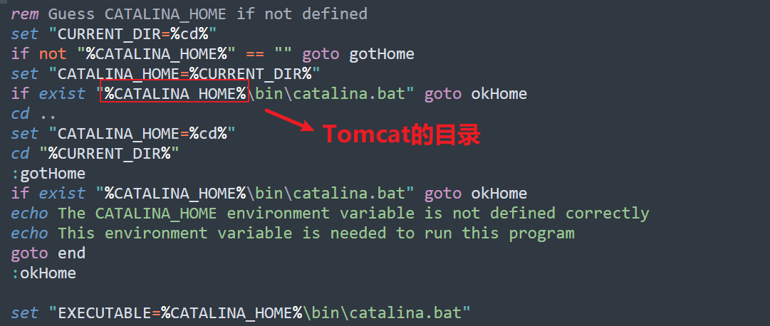 通过startup.bat 批处理文件,可知CATALINA_HOME 环境变量下有一个bin目录,而bin 目录又有一个catalina.bat文件,由此可知CATALINA_HOME 指向的应该是Tomcat安装的根目录
