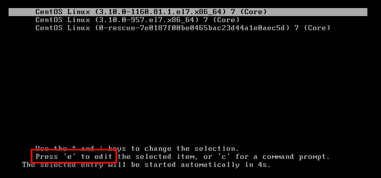 1: 首先,启动系统,进入开机界面,在界面中 按 e 进入编辑界面。如下图: