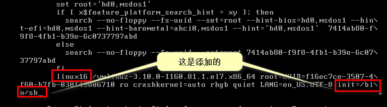 2: 进入编辑界面,使用键盘上的上下间吧光标往下移动,找到以 "linux16" 开头内容所在的行数,在行的最后面输入: init=/bin/sh 如下图: