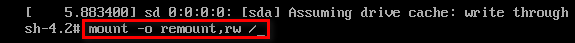 4:接着,在光标闪烁的位置 中输入: mount -o remount,rw / (注意:各个单词间有空格), 完成后按键盘的回车键(enter)。如图: