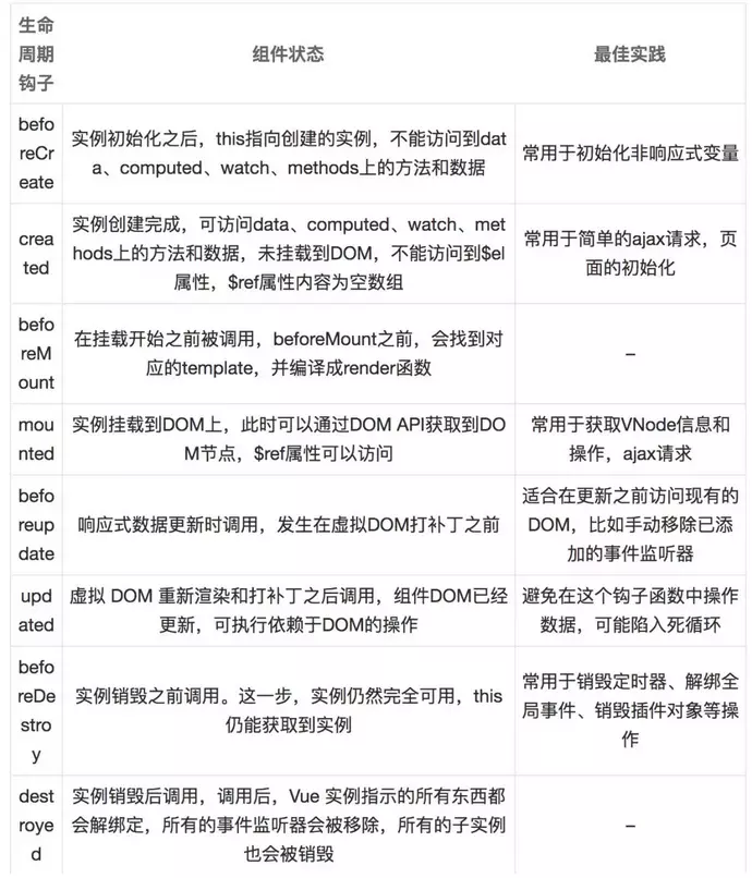 beforeCreate:在实例初始化之后,数据观测data observer(props、data、computed) 和event/watcher事件配置之前被调用。created:实例已经创建完成之后被调用。在这一步,实例已完成以下的配置:数据观测(data observer),属性和方法的运算,watch/event事件回调。然而,挂载阶段还没开始,$el属性目前不可见。beforeMount:在挂载开始之前被调用:相关的render函数首次被调用。mounted:el被新创建的vm.$el替换,并挂载到实例上去之后调用该钩子。beforeUpdate:数据更新时调用,发生在虚拟DOM重新渲染和打补丁之前。 你可以在这个钩子中进一步地更改状态,这不会触发附加的重渲染过程。updated:无论是组件本身的数据变更,还是从父组件接收到的props或者从vuex里面拿到的数据有变更,都会触发虚拟DOM重新渲染和打补丁,并在之后调用updated。beforeDestroy:实例销毁之前调用。在这一步,实例仍然完全可用。destroyed:Vue实例销毁后调用。调用后,Vue实例指示的所有东西都会解绑定,所有的事件监听器会被移除,所有的子实例也会被销毁。 该钩子在服务器端渲染期间不被调用。