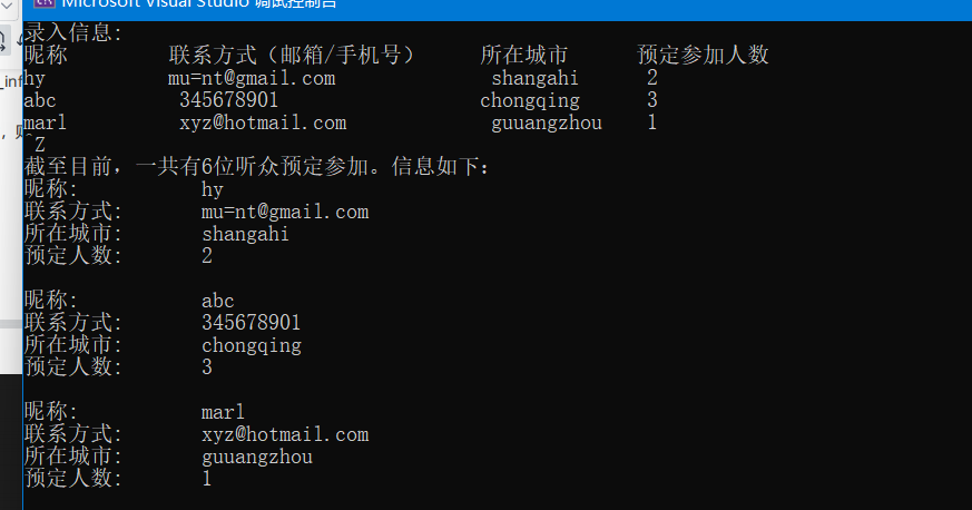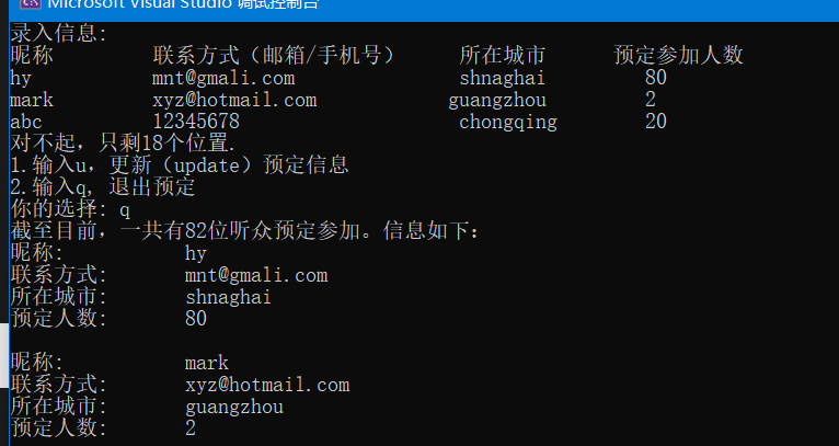 #include"Info.hpp" #include<string> #include<vector> #include<iostream> using namespace std; vector<Info> audience_info_list; int main() { cout << "录入信息:" << endl; cout << "昵称 联系方式(邮箱/手机号) 所在城市 预定参加人数" << endl; const int capacity = 100; int sum = 0; string s1, s2, s3; int num; int count = 0; while (cin >> s1 >> s2 >> s3 >> num) { sum += num; if (sum > capacity) { sum -= num; cout << "对不起,只剩" << capacity - sum << "个位置." << endl; cout << "1.输入u,更新(update)预定信息" << endl << "2.输入q, 退出预定"<<endl<<"你的选择: "; string f; cin >> f; if (f == "u") { cin >> s1 >> s2 >> s3 >> num; Info f(s1, s2, s3, num); audience_info_list.push_back(f); sum+=num; } else break; } else audience_info_list.push_back(Info(s1, s2, s3, num)); } cout << "截至目前,一共有" << sum << "位听众预定参加。信息如下:" << endl;; for (int i = 0; i < audience_info_list.size(); i++) { audience_info_list.at(i).print(); cout << endl; } return 0; }