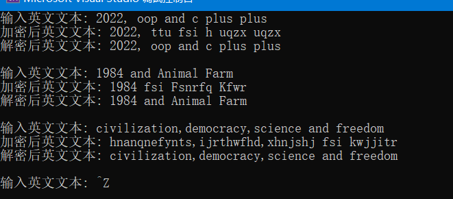 #include "Textcoder.hpp" #include <iostream> #include <string> void test() { using namespace std; string text, encoded_text, decoded_text; cout << "输入英文文本: "; while (getline(cin, text)) { encoded_text = TextCoder(text).get_ciphertext(); cout << "加密后英文文本:\t" << encoded_text << endl; decoded_text = TextCoder(encoded_text).get_deciphertext(); cout << "解密后英文文本:\t" << decoded_text << endl; cout << "\n输入英文文本: "; } } int main() { test(); }