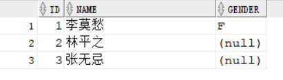 INSERT INTO student VALUES(0001,'李莫愁','F');