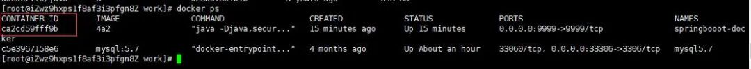 run:运行的意思–name:指定镜像启动的之后的名称-p:容器和外部的端口映射 第一个端口:外部 第二个端口:内部-d:后台运行 -t:实时运行,窗口关闭,程序结束。4a2:表示镜像的id(IMAGE ID)前3位,这里的id并不需要输入全称,只需要输入前几个就行,有一个前提:当有很多镜像的时候,前面几个字符就有可能会相同,这个时候就需要多输入几位,直到不相同位置。启动了镜像之后我怎么知道有没有成功呢?这个时候我们就需要一个命令来查看已经启动的任务