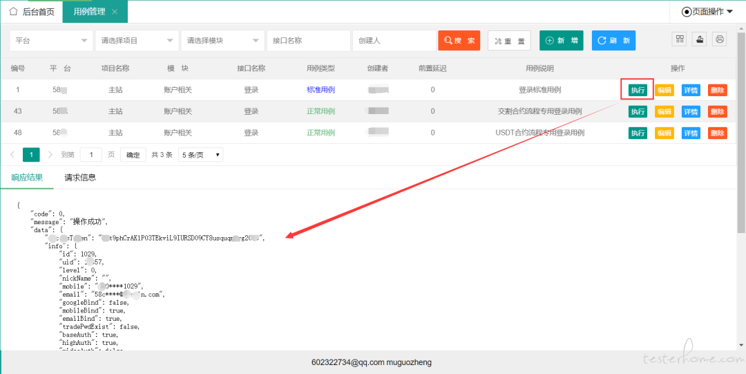- 操作栏点击【执行】按钮后,将发起一次接口请求,参数为该用例的数据。
