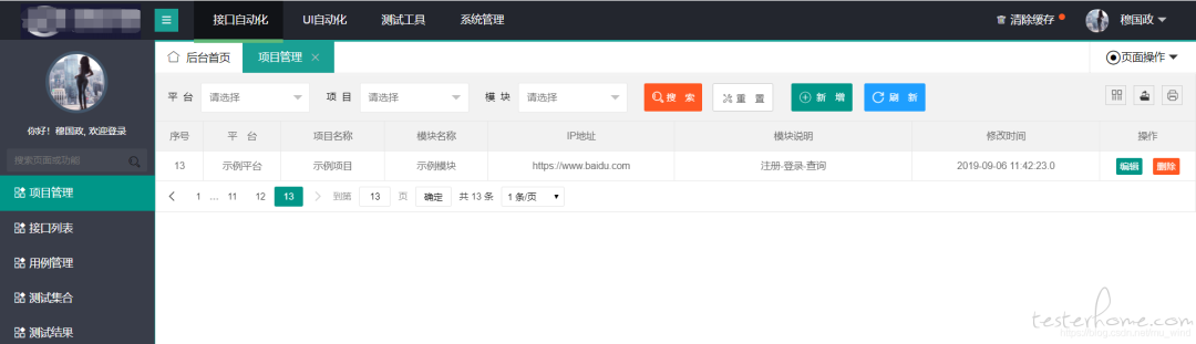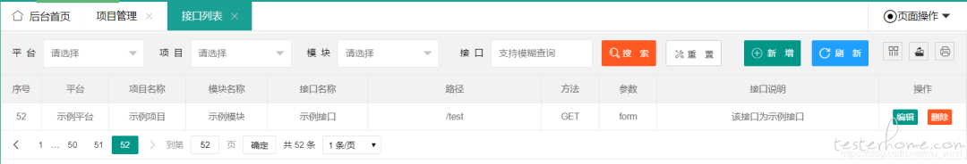 - 项目管理页面决定了每个接口的归属,当我们新增接口时,必须创建在已有模块下,而不能随心所欲地添加。因为平台使用人众多,如果不做此约束,数据将会十分混乱。