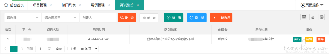 测试集合可以说是这个接口自动化平台的意义之所在。在接口自动化中,单接口调用参考价值有限,多个接口按照业务逻辑组成一条流程,才是接口自动化意义所在。当一系列接口用例创建完成后,在【测试集合】页面可以按照业务逻辑将它们组装起来,形成一个任务队列。下面说明一下如何编辑一条测试集合: