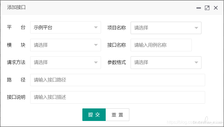 - 新增接口时,平台、项目、模块皆为选择项(可选择的数据来源于【项目管理】),而不能自行填入。