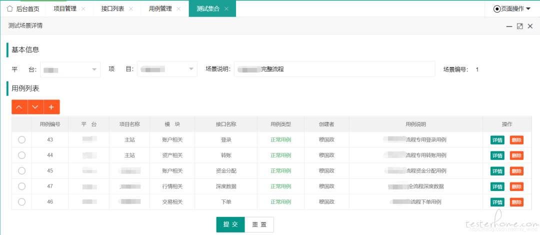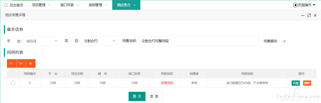 - 选择了用例后,回到测试集合详情页,用例顺序调整完毕后,点击【提交】按钮,将信息保存到数据库。同时,程序会自动生成【用例队列】(用例 ID 组成的队列)和【队列描述】(用例对应的接口名称组成的队列)。