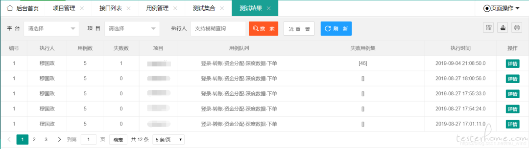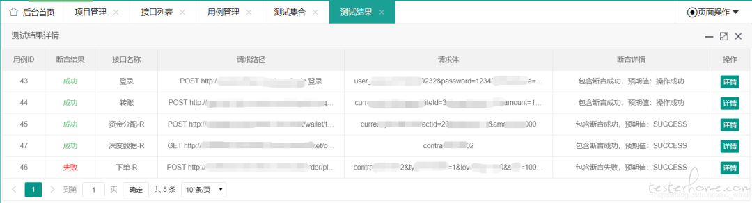 在【测试集合】页面选择执行某条测试集合后,程序将读取其对应的用例队列,并依次执行每个用例,最终生成一条测试集合的测试结果,并持久化保存在数据库中。点击【详情】按钮,进入测试结果详情页,查看某条测试结果的详情:
