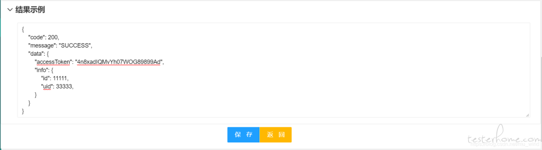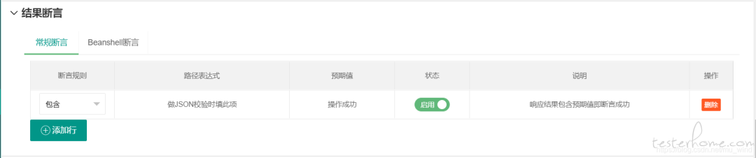4、结果断言:目前包括常规断言和 Beanshell 断言两种形式,其中常规断言包括:包含、相等、JSON 三种方式(已经能覆盖大多数应用场景,后续可以继续丰富)5、结果示例是接口返回结果的示例: