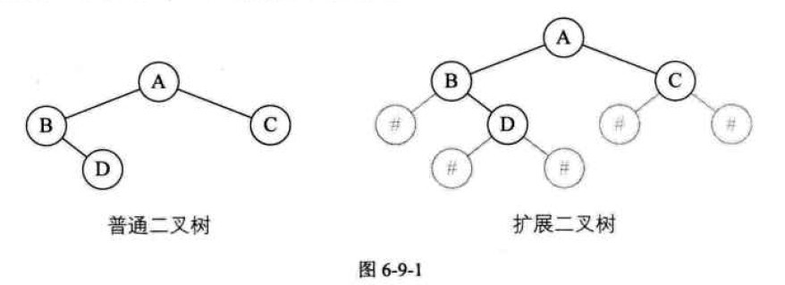 如果我们要在内存中建立一个如图6-9-1左图这样的树,为了能让每个结点确认是否有左右孩子,可以对它进行扩展,如右图那样,也就是将二叉树的每个结点的空指针引出一个虚结点,其值为一特定值,比如'#'。我们称这种处理后的二叉树为扩展二叉树。扩展二叉树就可以做到一个遍历序列确定一棵二叉树了。比如图6-9-1的前序遍历序列就为AB#D##C##。