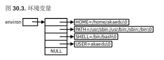 其中environ是全局变量但没有在头文件中声明,所以使用前需要外部声明一下。输出如下: