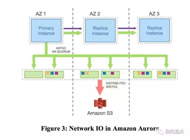 所以 Aurora 采用的是六副本,每个可用区两副本。这种架构可以保证写入操作可以容忍一个可用区不可用的情况 4/6,而读数据可以容忍一个可用区外加一台机器不可用的情况 3/6。一旦出现了一个可用区加一台机器不可用的 3/6 情况,写数据会被禁止,但是由于读数据可以进行可以很快的根据读出的数据再恢复出一个副本达到 4/6 状态恢复写入。