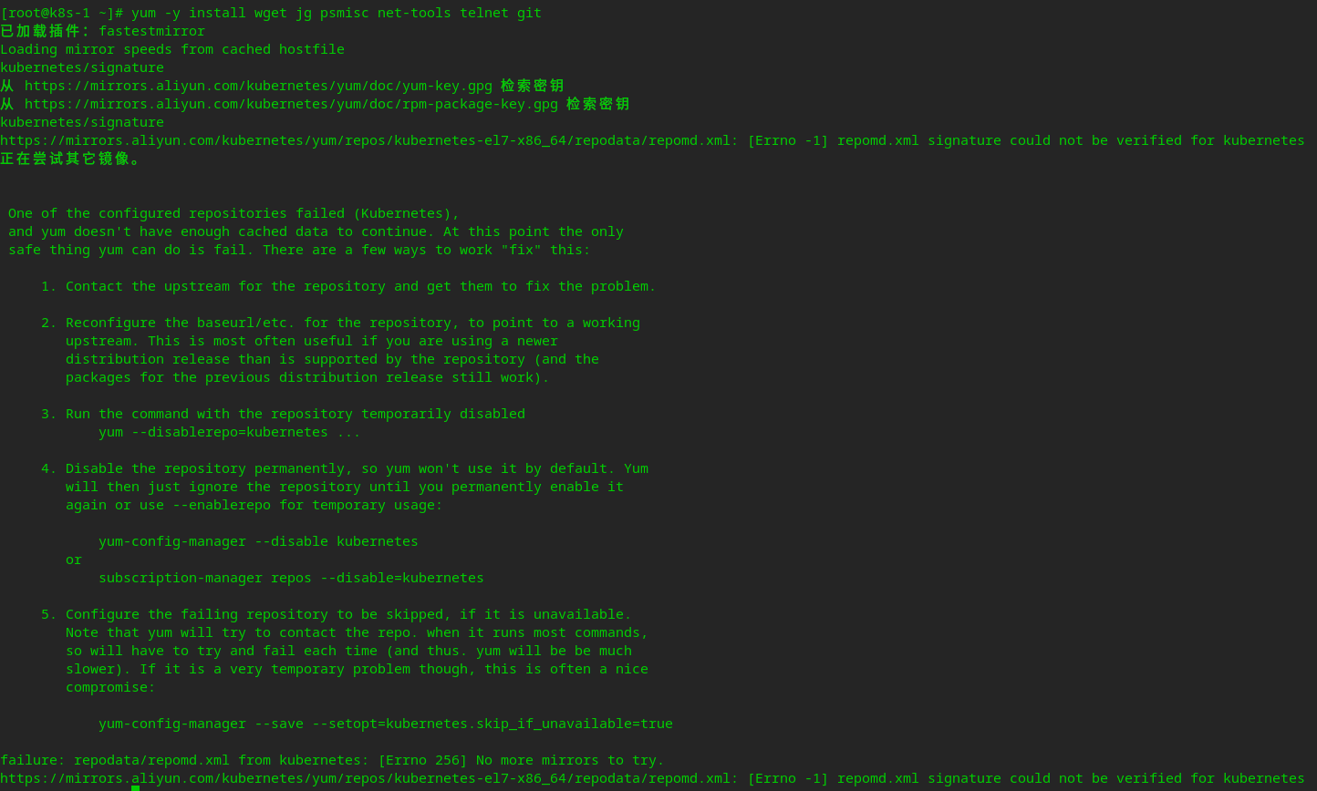 修改/etc/yum.repos.d/kubernetes.repo 里面的repo_gpgcheck=1 改为repo_gpgcheck=0
