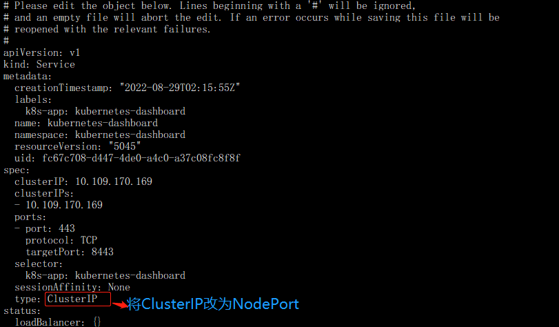 kubectl edit svc kubernetes-dashboard -n kubernetes-dashboard
