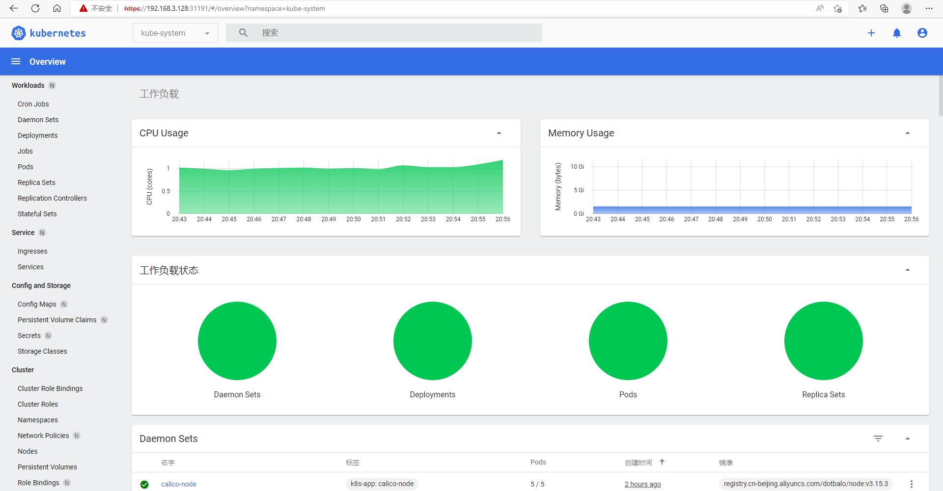 [root@k8s-master1 dashboard]# kubectl get po -A NAMESPACE NAME READY STATUS RESTARTS AGE kube-system calico-kube-controllers-5f6d4b864b-cwk6p 1/1 Running 1 18m kube-system calico-node-2j75v 1/1 Running 2 18m kube-system calico-node-66vdj 1/1 Running 0 18m kube-system calico-node-j9scc 1/1 Running 1 18m kube-system calico-node-tkjdj 1/1 Running 0 18m kube-system calico-node-v9v7x 1/1 Running 0 18m kube-system coredns-54d67798b7-wtlfb 1/1 Running 0 31m kube-system coredns-54d67798b7-zzn5g 1/1 Running 0 31m kube-system etcd-k8s-master1 1/1 Running 0 31m kube-system etcd-k8s-master2 1/1 Running 0 28m kube-system etcd-k8s-master3 1/1 Running 0 27m kube-system kube-apiserver-k8s-master1 1/1 Running 0 31m kube-system kube-apiserver-k8s-master2 1/1 Running 0 28m kube-system kube-apiserver-k8s-master3 1/1 Running 0 27m kube-system kube-controller-manager-k8s-master1 1/1 Running 2 31m kube-system kube-controller-manager-k8s-master2 1/1 Running 0 28m kube-system kube-controller-manager-k8s-master3 1/1 Running 1 27m kube-system kube-proxy-6w5z6 1/1 Running 0 31m kube-system kube-proxy-9dnxj 1/1 Running 0 24m kube-system kube-proxy-dhdcj 1/1 Running 0 25m kube-system kube-proxy-q28hc 1/1 Running 0 28m kube-system kube-proxy-q67fk 1/1 Running 0 27m kube-system kube-scheduler-k8s-master1 1/1 Running 2 31m kube-system kube-scheduler-k8s-master2 1/1 Running 0 28m kube-system kube-scheduler-k8s-master3 1/1 Running 0 27m kube-system metrics-server-545b8b99c6-mgfjr 1/1 Running 0 14m kubernetes-dashboard dashboard-metrics-scraper-7645f69d8c-mxwq2 1/1 Running 0 13m kubernetes-dashboard kubernetes-dashboard-78cb679857-qvvwx 1/1 Running 0 13m