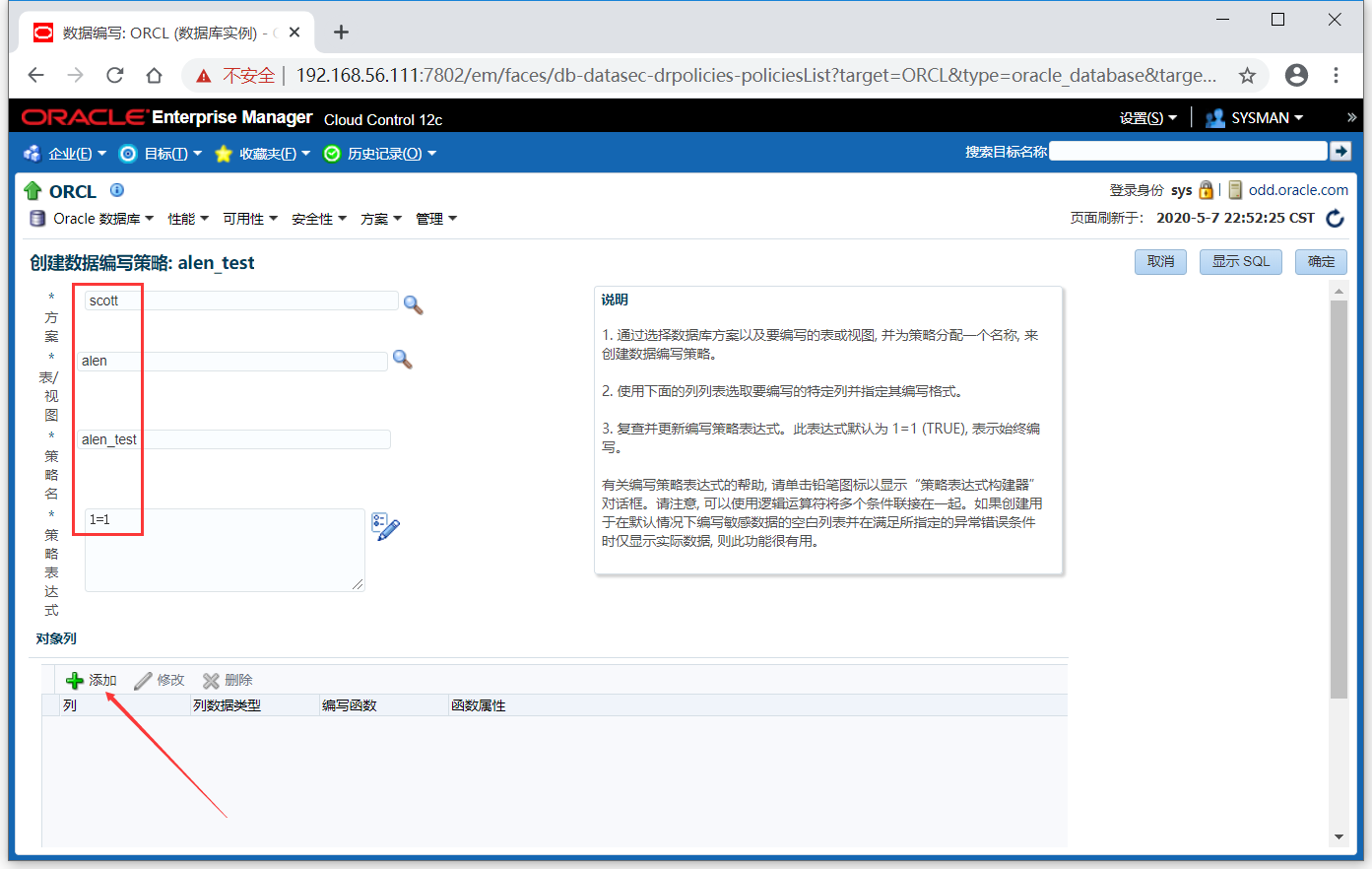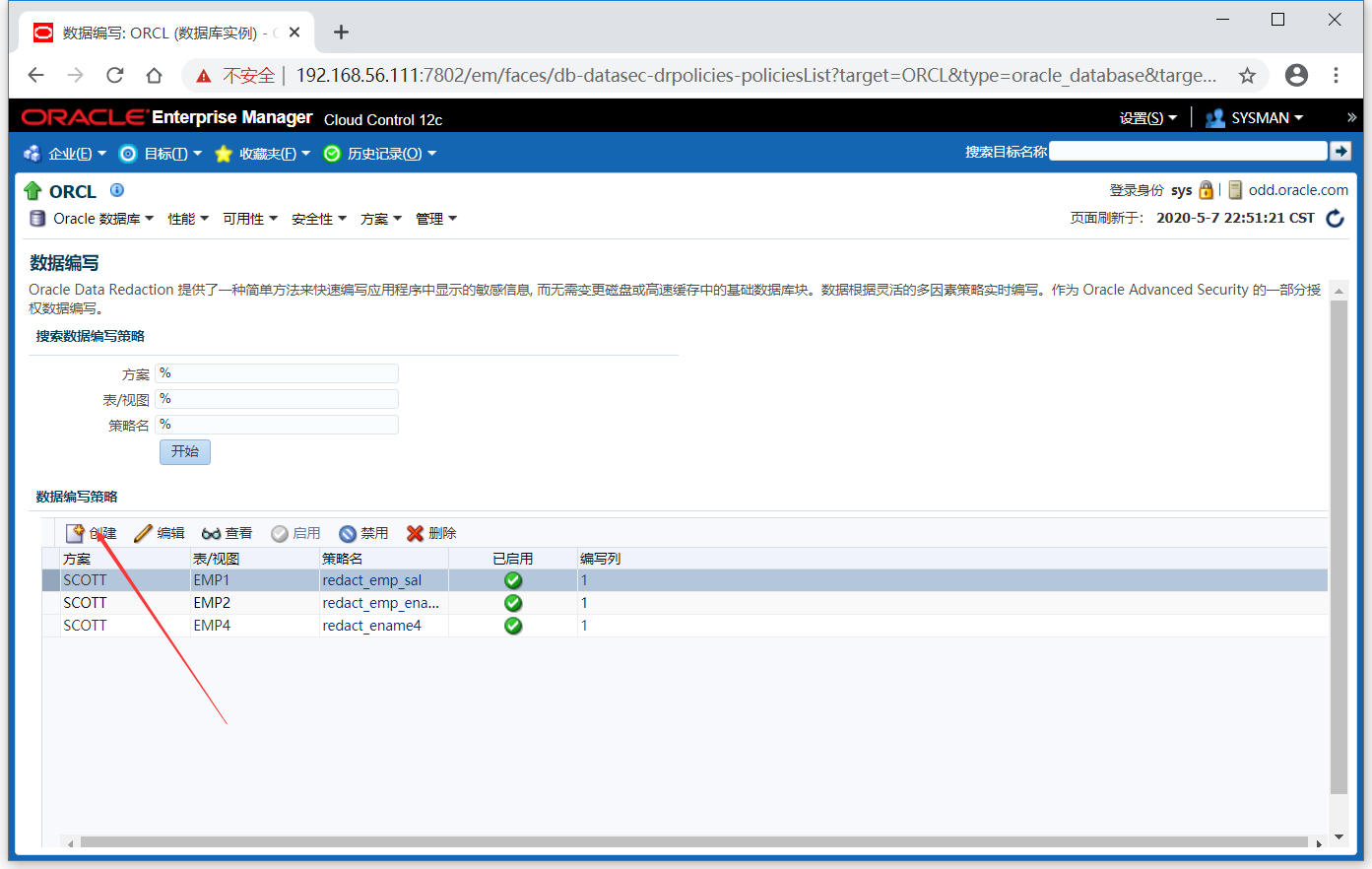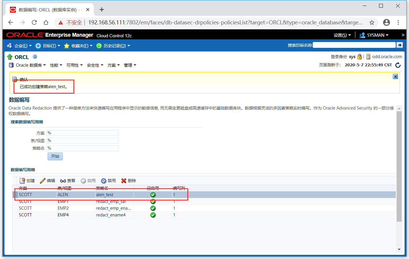 expression表达的意思是当会话用户是SH的话,会对ename字段进行加密。