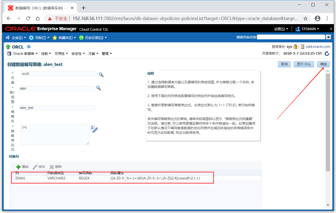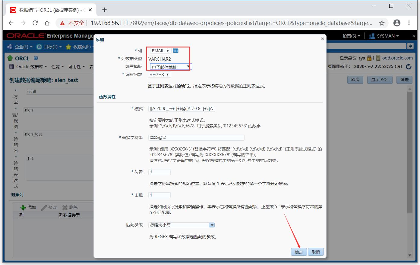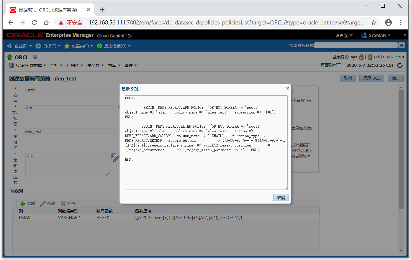 对于该类型的数据编写策略,function_type参数值固定为dbms_redact.regexp。