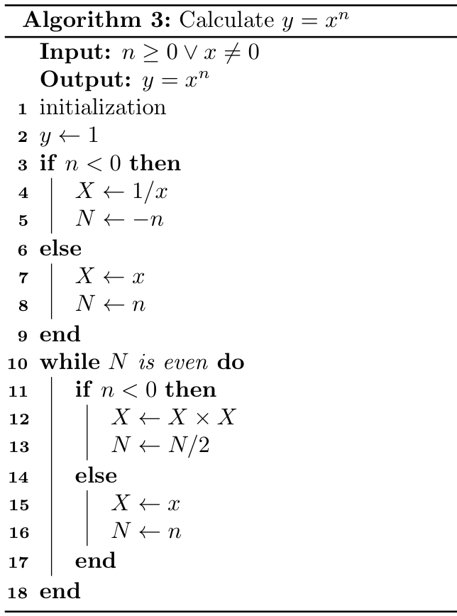 \usepackage[linesnumbered,ruled]{algorithm2e} \begin{algorithm}[H] \DontPrintSemicolon \SetAlgoLined \KwIn {$n \geq 0 \vee x \neq 0$} \KwOut {$y = x^n$} initialization\; $y \gets 1$\; \eIf {$n < 0$}{ $X \gets 1 / x$ \; $N \gets -n$ \; }{ $X \gets x$ \; $N \gets n$ \; } \While{$N$ is even}{ \eIf {$n < 0$}{ $X \gets X \times X$ \; $N \gets N / 2$ \; }{ $X \gets x$ \; $N \gets n$ \; } } \caption{Calculate $y = x^n$} \end{algorithm}