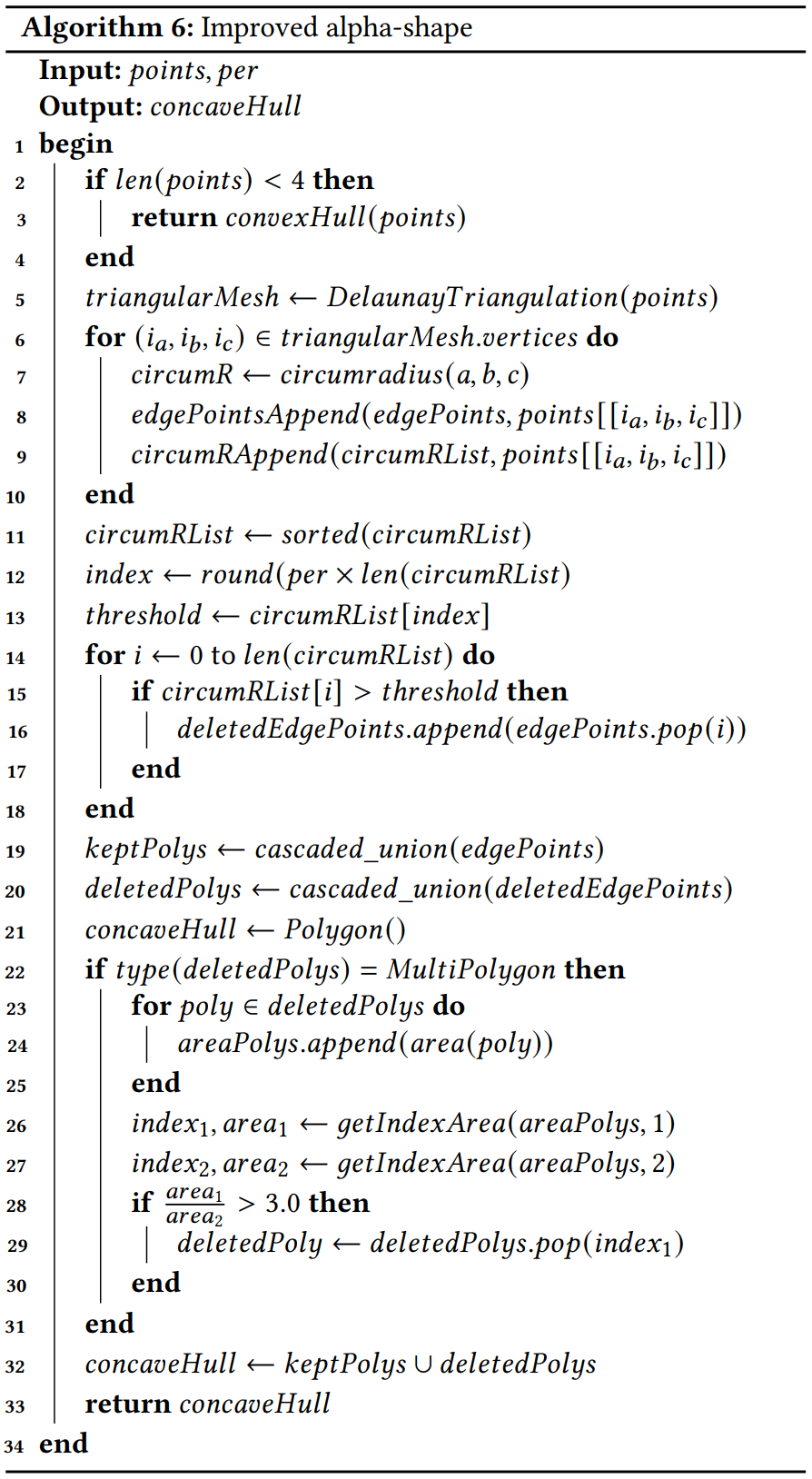 \begin{algorithm} \caption{Improved alpha-shape} \label{algorithm:alpha_shape} \SetKwData{In}{\textbf{in}}\SetKwData{To}{to} \DontPrintSemicolon \SetAlgoLined \KwIn {$points, per$} \KwOut {$concaveHull$} \Begin{ \If{$len(points) < 4$}{ \Return{$convexHull(points)$} } $triangularMesh \gets DelaunayTriangulation(points)$ \; % $edgePoints \gets []$ \; % $circumRList \gets []$ \; \For{$(i_a, i_b, i_c) \in triangularMesh.vertices$}{ $circumR \gets circumradius(a,b,c)$ \; $edgePointsAppend(edgePoints, points[[i_a, i_b,i_c]])$ \; $circumRAppend(circumRList, points[[i_a, i_b, i_c]])$ \; } $circumRList \gets sorted(circumRList)$ \; $index \gets round(per \times len(circumRList)$ \; $threshold \gets circumRList[index]$ \; % $deletedEdgePoints \gets []$ \; \For{$i \gets 0$ \To $len(circumRList)$}{ \If{$circumRList[i] > threshold$}{ $deletedEdgePoints.append(edgePoints.pop(i))$ \; } } $keptPolys \gets cascaded\_union(edgePoints)$ \; $deletedPolys \gets cascaded\_union(deletedEdgePoints)$ \; $concaveHull \gets Polygon()$ \; \If{$type(deletedPolys) = MultiPolygon$}{ % $areaPolys \gets []$ \; \For{$poly \in deletedPolys$}{ $areaPolys.append(area(poly))$ \; } $index_1, area_1 \gets getIndexArea(areaPolys, 1)$ \; $index_2, area_2 \gets getIndexArea(areaPolys, 2)$ \; \If{$\frac{area_1}{area_2} > 3.0$}{ $deletedPoly \gets deletedPolys.pop(index_1)$ \; } } $concaveHull \gets keptPolys \cup deletedPolys$ \; \Return{$concaveHull$}} \end{algorithm}