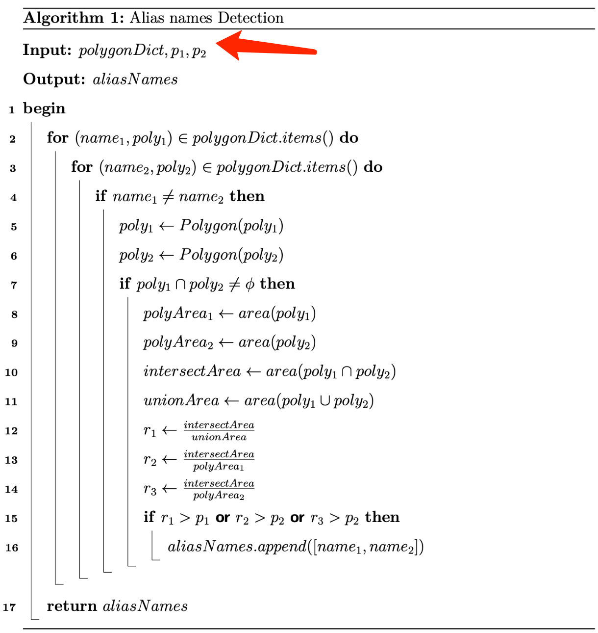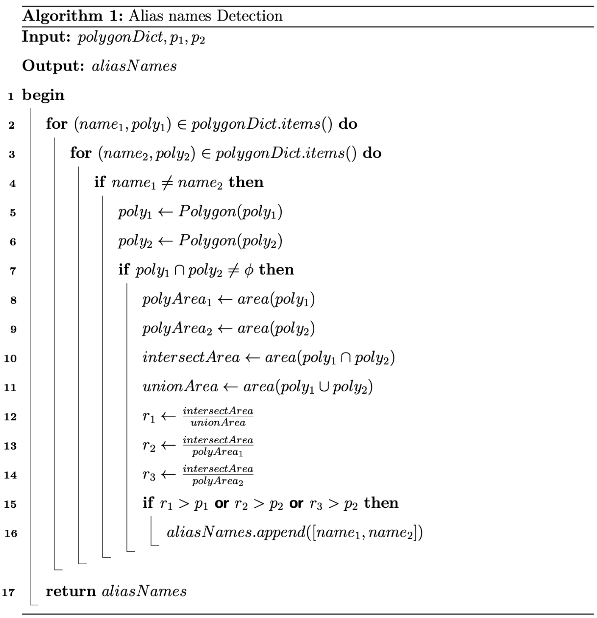 \usepackage[ruled,vlined,linesnumbered,ruled]{algorithm2e} \begin{algorithm}[!ht] \caption{Alias names Detection} \label{algorithm:alias_names} \SetKwData{Or}{\textbf{or}} \DontPrintSemicolon %\SetAlgoLined \KwIn {$polygonDict, p_1, p_2$} \KwOut {$aliasNames$} \Begin{ % $aliasNames \gets []$\; \For{$(name_1, poly_1) \in polygonDict.items()$}{ \For{$(name_2, poly_2) \in polygonDict.items()$}{ \If{$name_1 \neq name_2$}{ $poly_1 \gets Polygon(poly_1)$ \; $poly_2 \gets Polygon(poly_2)$ \; \If{$poly_1 \cap poly_2 \neq \phi$}{ $polyArea_1 \gets area(poly_1)$ \; $polyArea_2 \gets area(poly_2)$ \; $intersectArea \gets area(poly_1 \cap poly_2)$ \; $unionArea \gets area(poly_1 \cup poly_2)$ \; $r_1 \gets \frac{intersectArea}{unionArea}$ \; $r_2 \gets \frac{intersectArea}{polyArea_1}$ \; $r_3 \gets \frac{intersectArea}{polyArea_2}$ \; \If{$r_1 > p_1$ \Or $r_2 > p_2$ \Or $r_3 > p_2$}{ $aliasNames.append([name_1, name_2])$ } } } } } \Return{$aliasNames$}} \end{algorithm}