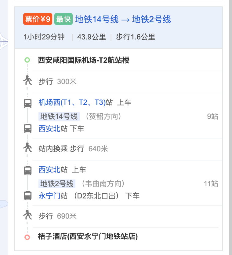 5.27 大连 → 西安 长安通电子卡 apple pay可用 地铁:时间6:00-23:00 出租车:黄色/绿色出租车 网约车