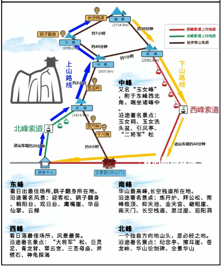 路线:西峰索道上→西峰顶→南峰(最高峰)→东峰→中峰→北峰→北峰索道 金庸题字的华山论剑碑在北峰
