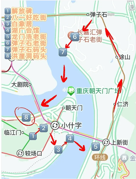 解放碑 → 八一好吃街(轻轨1/2号线校场口下车)→ 白象居(居民楼 轻轨1/6号线小什字站) → 湖广会馆(需要提前公众号“重庆湖广会馆”预约 地铁1号线小什字站→长江索道(轻轨1号线小什字站5B出口 建议时间17:00-18:00 建议早上玩 下午要排队 往返30 公众号“长江索道”提前预约)(时间不够第二天去)龙门浩老街→弹子石老街→怀旧轮渡(10元) → 洪崖洞(轻轨1/6号线小什字站 需要提前公众号预约 建议19:00-22:00) →土货老火锅→ 千厮门大桥