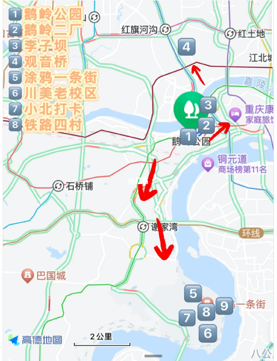 酒店 → 山城步道 鹅岭公园→ 鹅岭二厂(轻轨1号线鹅岭站)→ 李子坝(轻轨2号线李子坝站) → 北仓文创(轻轨3号线观音桥站) → 观音桥步行街(地铁3/9号线观音桥站) →涂鸦一条街→四川美术学院→交通茶馆→铁路四村→老甘家小龙虾→暹罗之屿(推荐满血复活套餐)!