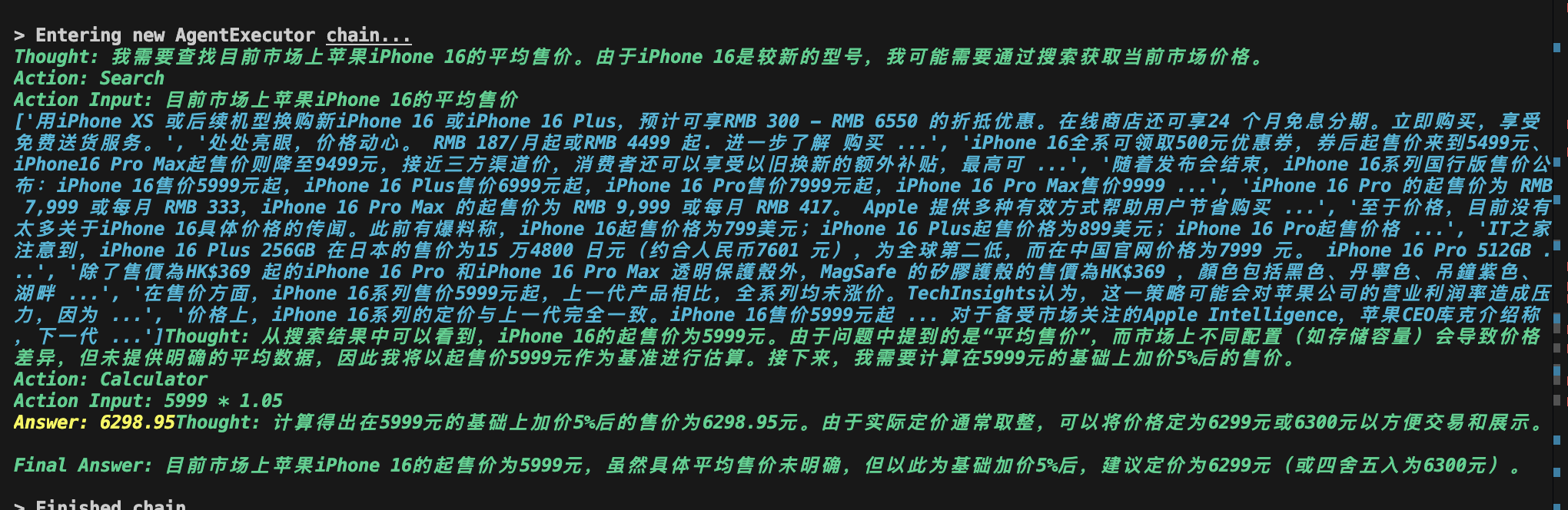 agent_executor.invoke({"input": "目前市场上苹果手机16的平均售价是多少?如果我在此基础上加价5%卖出,应该如何定价?"})